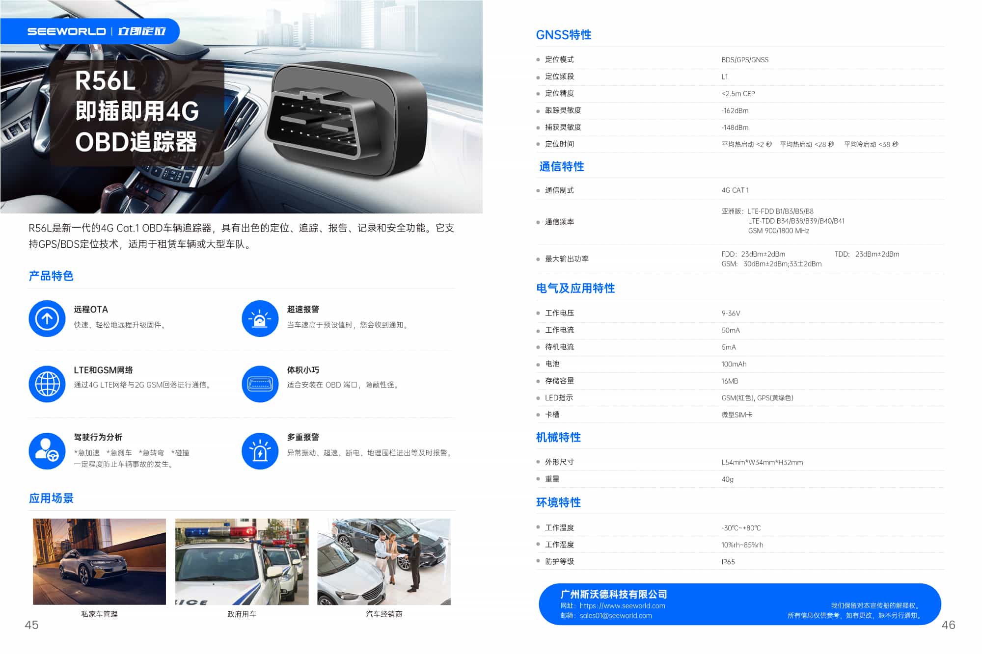 R56L是新一代的4G Cat.1 OBD車輛追蹤器,具有出色的定位、追蹤、報告、記錄和安全功能。它支持BDS/GPS/GNSS定位技術,適用于租賃車輛或大型車隊。