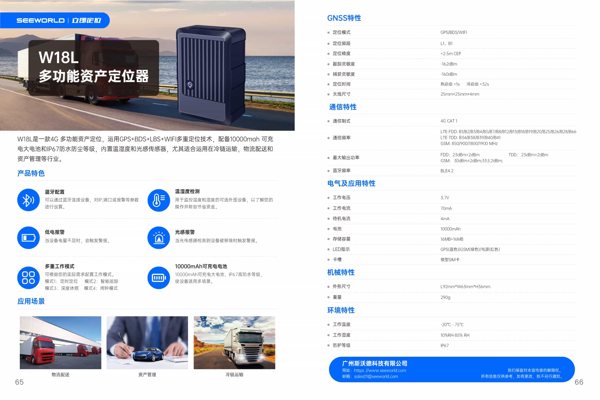 W18L是一款4G 多功能資產定位,運用GPS+BDS+LBS+WIFI多重定位技術,配備10000mah 可充電大電池和IP67防水防塵等級,內置溫濕度和光感傳感器,尤其適合運用在冷鏈運輸,物流配送和資產管理等行業。